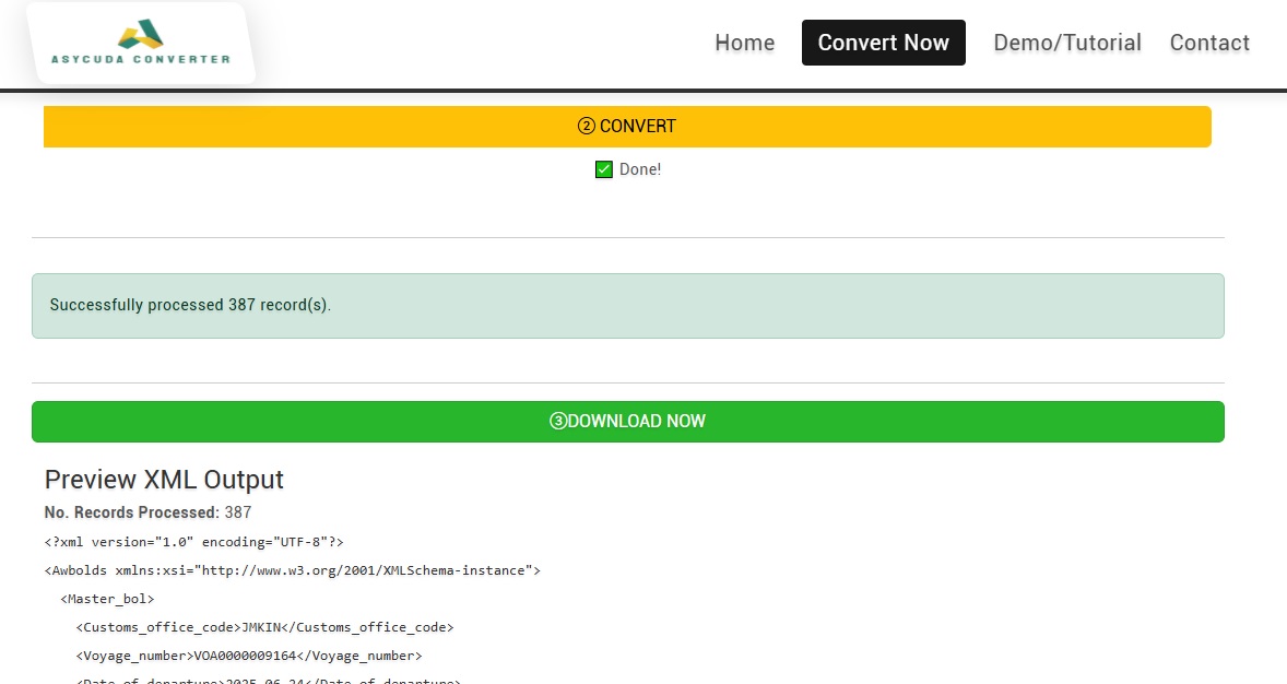 After your setup, youโll be able to generate ASYCUDA XML files in seconds using your saved configuration, perfect for ongoing high-volume processing.